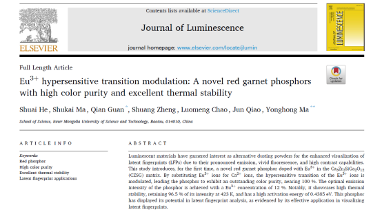 今年,公司贺帅老师在《Journal of Luminescence》(中科院2区,影响因子3.3)刊发了学术论文《Eu³⁺ hypersensitive transition modulation: A novel red garnet phosphors with high color purity and excellent thermal stability》。该研究小组依托公司“稀土发光材料”研究平台,开展了红色石榴石结构荧光材料的设计及其在光学领域的应用研究。